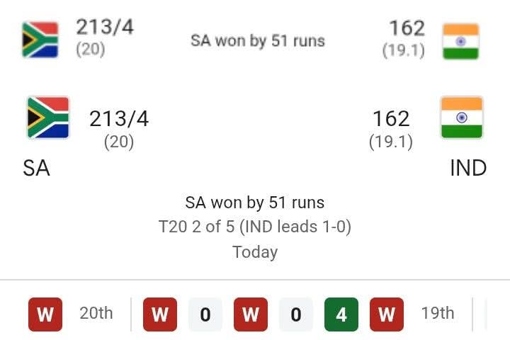 51 রানে জিতে গেল দহ্মিন আফ্রিকা । South Africa Won by 51 Run. South Africa vs India 2st T20 match . India team All wickets down.