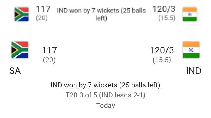 দহ্মিন আফ্রিকার বিপক্ষে ভারতের দুর্দান্ত জয় লাভ। India won by 7 wickets (25 balls left). South Africa vs India T20 match.